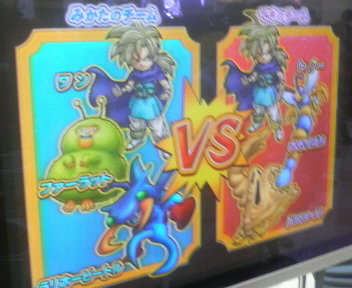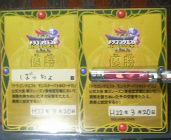 こんばんは~、ばっちょです。 今日の代表勇者大会はどうだったのかな さて、今日はいつものごとく大会に行ってきました~AMにも小学生以下のシングルステップアップがあったんですが、こちらは回避息子がどうもステップアップに気乗りしない様子ということで、AM中はSCで大魔王と戯れてました そして、PMの無制限ペア戦エントリーは28組ばっちょ家はというと、5番目に呼ばれました~ でも、トーナメント表を見ると順当に勝っていったとしてもお仲間さんばかり・・・勿論、お仲間さんは皆さん強豪ばかりですよ ということで、いつものデッキと結果です※上が息子、下がばっちょです 【1回戦】お相手 :バトマス(ほしくだき)、メタルハンター、ドラゴンライダー 魔法使い(りりょくの杖)、ゴールドマン、ナイトリッチばっちょ家:魔法使い(りりょくの杖)、ギズモ、デンタザウルス 戦士(グレートアックス)、ナイトリッチ、ドラゴンキッズ1回戦からビバンダムさん家。いつも乱対やら検証やらお世話になっているだけにかなりやりにくい何とかつばぜりに勝ったものの、結局5ターン目、こちらのモンスが最後に動いたことでやっとオーブ満タンでとどめの一撃で勝利 【準決勝戦】お相手 :魔法使い(りりょくの杖)、キャタピラー、キースドラゴン バトマス(グレートアックス)、ナイトリッチ、ダッシュランばっちょ家:1回戦と変更せず準決勝はれんぱぱさん家。やはり順当に勝ち上がってきましたね~こちらも2ターン目のつばぜり勝負で勝利けど、グレートアックスの攻撃が効果的に決まっていたことで、ばっちょ家は4ターンでオーブ溜めきれず5ターン目にSP戦いのドラムを挿されるも、何とか攻撃を凌いでとどめの一撃で勝利【決勝戦】お相手 :バトマス(風林火山)、ナイトリッチ、キースドラゴン 賢者(りりょくの杖)、ずしおうまる、シャドーサタンばっちょ家:勇者(天帝の剣)、デンタザウルス、キースドラゴン 魔法使い(りりょくの杖)、ギズモ、ナイトリッチ決勝戦はるいぱぱさん家シングル戦では何度か対戦してますが、ペア戦での対戦は初めてるいぱぱさんがずっとシャドーサタンを使っていたので、デッキを変更つばぜりにも勝利し、上手く滅魔斬がシャドーサタンを2回攻撃でも途中上手く攻撃がかみ合わず、またもや5ターン目に突入それでも序盤でROMが味方していたこともあり、何とかとどめの一撃で勝利 ということで、優勝レジェンドになってからペア戦は3度目の正直ということで 今日は対戦して下さった皆さん、ありがとうございました それにしても、やはりお仲間さんは楽に勝たせてくれませんね・・・精神的にかなり疲れました大会的にはかなり楽しかったですけどね~ ではっ