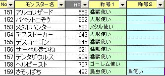 こんばんは~、ばっちょです。 いや~、今週は仕事が忙しくてあんまり平日プレイに行けてないですよ・・・1週間もプレイしないとつばぜりが衰えてる さて、本日はモンスター称号について パペットこぞうは未所持ですが、見た目で判断ですさそりばちは恐らくビートルマスターとウィングマスターのWアップです。あとは以外に猛獣使いが多いでも、デスゴーゴンやデンタザウルスなんか打撃耐性が付いているので、まじゅうのツメでも思った以上のダメージを与えられないかなまじゅうのツメよりも耐性無視の武器の方が安定してダメージを与えられそうですね それよりもMWSした場合の効果の方が気になる ではっ