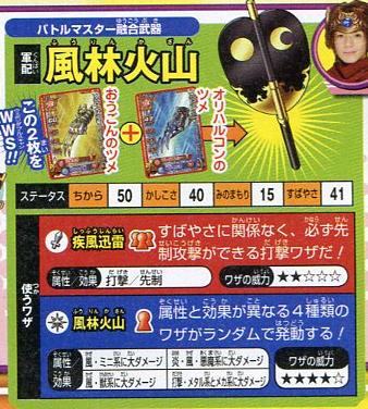 こんばんは~、ばっちょです。 今日は最近の仕事の忙しさの合間をぬって、ちょっと早めに帰ってきたのですけど、ばっちょのPCからブログにアクセス出来ず・・・結局いつもの時間での更新となってしまいました さて、昨日はVジャンネタで書きましたが、今日もその続きというより、ついにあの武器の詳細が公開されてましたね 『風林火山』青技「風」:ミニ系に特攻「林」:風属性、獣系に特攻「火」:風属性、炎属性、悪魔系に特攻「山」:メタル系とメカ系に特攻ということでした。ちなみにばっちょの推測もかなりイイ線までいってた コチラ今回、検証するのに難航を極めた要因としては、特攻の効果だったのか、弱点属性で攻撃されたのかが分かりにくかったこと。あともうひとつは「火」に風属性が含まれてたってことでしょうかただデッキに組み込む際に注意しなきゃいけないのは、特攻対象になっているモンスター以外でも、かなりのダメージを喰らってしまう可能性があるってことですね。例えば、不死系のモンスターは炎属性に弱いことが多いので、「火」の攻撃は要注意だったりしますでもそんなことばっかり考えてると、強いデッキは作れませんので対戦相手に応じて上手くモンスターを変更してあげれば、それ程脅威でもないように感じますね~ ではっ