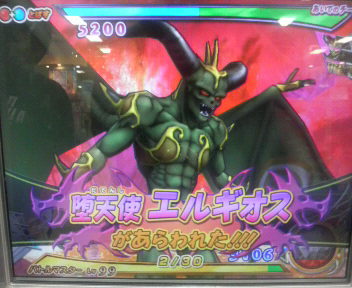 こんばんは~、ばっちょです。 『逆襲の魔王』稼働日!!ってことで、朝から突撃された方も多くいらっしゃったようですが、ばっちょは勿論仕事を終えてからけど、ちょっと仕事を片付けるのに手こずってしまい、満足にプレイに方は出来ませんでした とりあえず、堕天使エルギオス討伐が目的で 4クレ目だったかな闇竜バルボロスが登場試しにSP秘剣ドラゴン斬りしたら、ダメージ1000を超えますね無難に倒して・・・ 堕天使エルギオス登場!思った以上にHPは少ないけど、極悪そうな顔してますね~1ターン目:あやしいひとみ2ターン目:つばぜり勝ち3ターン目:いてつくはどう4ターン目:あやしいひとみ3ターン目以降エルギオスの出した技は完全うろ覚えです・・・隣の台でもエルギオスが登場してましたが、マダンテ・・・超~強力だねということで、 堕天使エルギオス討伐!! つばぜり仕掛けるタイミングとしては2ターン目が良いかもしれないですね 冒険の書もこんな感じになりました~ あと例の技を試してきましたよセット装備技:竜神王の剣(ドラゴンキラーWWS)、竜神のよろい、竜神のたてWWSは勇者専用みたいだね。赤技:竜滅剣(単体攻撃)青技:封竜剣(全体攻撃) ドラゴンキラーをWWSしないで、竜神3神器にした場合、第3の技が発動しますよ~青技がドラゴンデストロイに変化します 明日から本格的にプレイしてきますね~ ではっ
