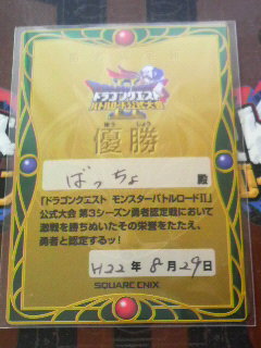 こんばんは~、ばっちょです。 本日はいよいよ追加公式戦、最終日!! 地元でもレジェンド最後の大会がありましたので、参戦して来ましたよ無制限シングル戦ですエントリーの方は締め切り直前での登録が一気に増加結果的には50名のエントリーでした。 昨日の雪辱はありますが、とりあえず息子に抽選突破して欲しいことでずっと祈ってました・・・が、思い叶わず、ばっちょだけ抽選突破!(苦笑最後の最後に息子に抽選突破して欲しかったんですけどね~ とりあえず、息子の分まで頑張ろうということで本日も本気バージョンで(笑デッキと結果です 【1回戦】お相手 :バトマス(グレートアックス)、ナイトリッチ、デュラハーンばっちょ :勇者(神竜の剣)、ナイトリッチ、キースドラゴンお相手はお友達のりなぱぱさん家の長女さん。2ターン目につばぜりを仕掛け、ゲージも黄色MAXけど、競負けちゃった・・・危ないところでしたが、何とか削りきって勝利【2回戦】お相手 :勇者(神竜の剣)、メタルハンター、デスゴーゴンばっちょ :勇者(神竜の剣)、デンタザウルス、キースドラゴンお相手は男性の方。つばぜりはゲージが微妙でしたけど、何とか競り勝ち大きなミスもなく、とどめの一撃で勝利【準決勝戦】お相手 :勇者(神竜の剣)、メタルハンター、ダッシュランばっちょ :戦士(グレートアックス)、ナイトリッチ、メタルハンターお相手は地元強豪のKさん家のお子さん。1~2回戦と大人相手に勝ち抜いてきた強者です。こちらのアックスドライバーで主人公を足止めした為、3ターン目につばぜりあい・・・が、ばっちょが思いっきりゲージをミスってしまい競負けSPグリンガムのムチでお相手の勇気が溜まる寸前で何とか足止めに成功し、5ターン目に削りきって勝利でした【決勝戦】お相手 :勇者(神竜の剣)、ナイトリッチ、デンタザウルスばっちょ :戦士(グレートアックス)、ナイトリッチ、メタルハンターお相手はまたもや地元強豪のSさん家の長男くん。2~3回戦とSPを巧みに使って勝利してきたお子さんです。2ターン目にばっちょからつばぜりを仕掛けて競り勝ち3ターン目にSPを仕掛けてくるだろうなと思い、こちらもSP正義のソロバンでお相手の攻撃を最小限に抑え・・・ 優勝することが出来ました!いや~、本気バージョンと言いながら、2回もつばぜり負けするとは思ってもみませんでしたけどね・・・対戦して下さった皆さん、ありがとうございました ではっ