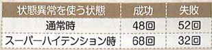 こんばんは~、ばっちょです。 何か1日間違えてた・・・?!ブログの更新をしたと思ってたのに、更新してませんでした(爆 完全にボケてましたよ(汗 さて、気を取り直して前回の続きです状態異常の成功率はスーパーハイテンションで変わる皆さんもご存知のスーパーハイテンション効果は与えるタメージを1.5倍にするわけですが、状態異常技はどうなるのということです。<実験方法>通常時とSHT中のふたつの状態で、おばけきのこのあまい息をデンタザウルスに100回ずつ使用。成功率に違いがあるのかを実験。結果は通常時が48%、SHTを使用したときは68%の成功率結果としてはほぼ1.5倍近くの効果ということで、状態異常技にSHTは有効ということですね 呪いの効果で動けなくなる確率はいわゆる装備すると呪われてしまうアイテム。それがいったいどのくらいの確率なのかを実験。<実験方法>呪われてしまう装備をひとつずつ装備して100回行動。呪いで何回動けなくなってしまうのかを実験。ついでに「セット装備」でも動けなくなる確率も実験。 以上のような結果から約10%前後の確率で動けなくなってしまうようです。ちなみに「セット装備」の方は約50%と2回に1回は行動不能に・・・ モンバトならここで検証終了ですが、ビクトリーならではの要素「おしゃれ着」で『呪い効果』を下げるものがありましたよねその結果がコチラクリフトの帽子とクリフトのふくはそれぞれ呪い効果が▲5%合計で▲10%にしてみたらというのが上記の結果でした~ばっちょもおうごんのツメをつけてみましたが、1回も呪われずけど帽子だけにしたら、10戦中1回だけ呪われちゃいました「おしゃれ着」でバレバレですけど、使う価値はありそうですねあっ、でもアレに弱くなるんですよね・・・(汗 ではっ