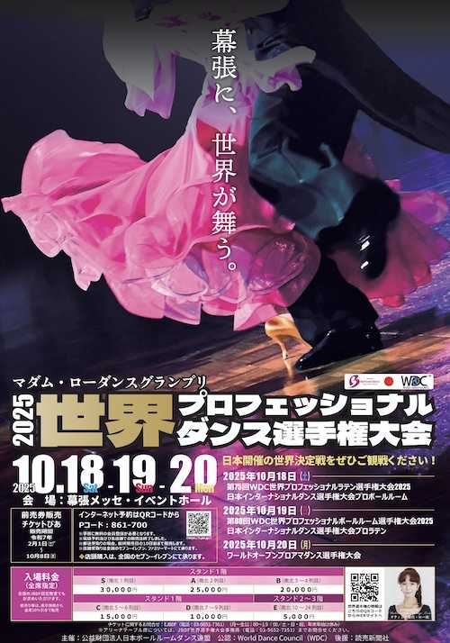 2025年WDC世界プロフェッショナルダンス選手権大会が19年ぶりに日本開催となりました。10月18日・19日の二日間、ラテンとボールルーム両方の世界選手権が一度に見られる千載一遇のチャンス。通常6月に開催されるJBDF日本インターも併催されることになったビッグ・イベントです。1日目はラテン世界選手権が行われ、併せて日本インターのプロ・ボールルーム、アマ・ラテン、ジュニア・ラテンの競技が行われました。会場は幕張メッセです。世界選手権ラテンは各国を代表する2組のペアが出場し、その年の世界チャンピオンを決定する競技で、日本からは野村 直人 & 山﨑 かりん組と八谷 和樹 & 皆川 円 組が選抜されています。国代表の他にもWDC登録選手で世界ランキング48位以内の選手、国内ではJBDFランキング36位以内の選手、各広域加盟団体からの選抜選手、JCFの代表選手等が出場して、海外から44組、総勢94組のカップルがエントリーしました。ロシアの選手は国代表ではなく個人参加という扱いになっています。*********************************************************************プロ・ラテン世界選手権 エントリー94組*********************************************************************1. Dorin Frecautanu・Marina Sergeeva(イギリス)2. Kirill Belorukov・Valeriya Aidaeva(個人参加)3. Pasha Zvychaynyy.・Polina Teleshova(個人参加)4. Klemen Prasnikar・Alexandra Averkieva(スロベニア)5. Salvo Sinardi・Alexandra Kondrashova(イタリア)6. Tal Livshitz・Ilana Keselman(アメリカ)7. 野村 直人・山﨑 かりん(日本)野村・山﨑組が決勝入りして会場は大盛り上がりでした。八谷・皆川組は残念ながら準々決勝まで。1次予選からすばらしい選手たちによる競演でした。日本インターの競技結果は以下の通りです。*********************************************************************日本インター プロ・ボールルーム エントリー189組*********************************************************************1. 福田 裕一・エリザベス グレイ(日本)2. Bichurov Pavel・Raevskaya Liudmila(個人参加)3. Anton Besedin・Anastassiya Popova(個人参加)4. Alexey Tsarev・Alena Stadnik(個人参加)5. 金野 哲也・井之口 香織(日本)6. 小林 恒路・赤沼 美帆(日本)日本インターで外人選手でなく日本人が優勝という快挙は歴史的かもしれません。素晴らしいです。おめでとうございます。*********************************************************************日本インター アマ・ラテン エントリー84組*********************************************************************1. 町田篤人・山﨑笑夢(日本)2. 海老原 拳人・タカギルナ(日本)3. 高橋 海・小西 乙愛(日本)4. 小島 獅桐・鉄島 芽衣(日本)5. 津田 琥汰朗・津田 マリア(日本)6. Andreas Hiim・Maria Hanse(ノルウェー)去年のチャンピオン海老原・タカギ組を抑えて町田・山﨑組が優勝でした。こちらもまたドラマチックでしたね。*********************************************************************日本インター ジュニア・ラテン エントリー25組*********************************************************************1. Domenico Burns・Juliana Gekker(アメリカ)2. 原澤 英大・竹之内 梨音(日本)3. 赤瀬 優斗・吉崎空乃(日本)4. 福原 聖太・土屋 海音(日本)5. 藤枝 修也・林 日和(日本)6. 児山 遥都・関根 乙央(日本)優勝したアメリカの選手はドニー・バーンズの息子さんだそうです。往年の世界チャンピオンを父に持つ二世選手は上手くて当然と思われてしまいますから大変でしょうね。ドニー・バーンズMBEも世界選手権の審判として参加されていて、WDCを代表してご挨拶もされてました。競技会情報はこちらから