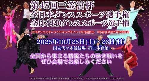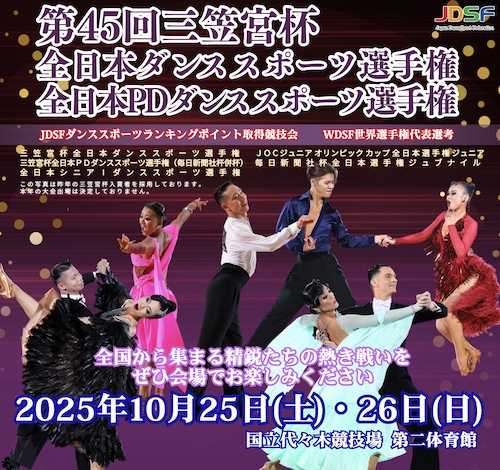国立代々木競技場 第二体育館において、第45回三笠宮杯全日本ダンススポーツ選手権が開催されました。大会は2025年10月25日(土)と26日(日)の2日間です。一日目は三笠宮杯スタンダード、三笠宮杯PDラテン競技があり、この他に全日本ジュニア、全日本ジュブナイル、全日本シニア I のスタンダード競技がありました。ジュニアはJOCジュニアオリンピックカップ、ジュブナイルとPDは毎日新聞社杯の冠がつきました。結果は以下の通りです。<三笠宮杯アマ・スタンダード>エントリー80組優勝 小嶋みなと・盛田めぐみ準優勝 守屋 駿 ・盛田舞香3位 ホワイトン 謙心・ホワイトン 夏奈実4位 中村 エドワード 漸・中村 エリザベス 永理5位 倉科 翼・尾身 菜月 6位 Kampert Alexander・鎮西 春奈 三笠宮杯アマは、カップルのどちらかが2025年末までに満15歳以上のJDSF登録選手であり、シード及び各ブロックと学連の選抜選手もしくはJDSF推薦選手であるか、10月5日(日)の最終選考会で選出された選手が出場できます。小嶋・盛田組、チャンピオンに復帰ですね。おめでとうございます。6位に入った外人選手は都県別戦のスタンダード千葉県優勝に貢献した選手、オレクシーに習ってるようです。昨年優勝の大西組はパートナーがPD転向で、リーダーはダンスタイムのアテンダントをされていました。<三笠宮杯PD・ラテン>エントリー14組優勝 久保田 弓椰・徳野 夏海(TEAM YUMIYA北海道)準優勝 西 恭平・西川 真由(LIBERA DANCE)3位 岸田 肇 ・岡田 祐子(岸田ダンスアカデミー) 4位 髙辻 博希・岡田 優美(タカツジ・ダンス・スタジオ)5位 近藤 寛之・西川 真由 (水田ダンススタジオ )6位 上原 伸之・家入 由佳 (DoA Studio )出場組数はPDグランプリランキング等で24組までに制限されています。久保田・徳野組、四連覇おめでとうございます。全日本シニア I スタンダードはエントリー33組で、優勝は茨城の二刀流の 石田 茂之・矢野 美帆子 組でした。シニア I の出場資格は、2025年末の満年齢が34歳以上と29歳以上のJDSF登録選手となっています。来年の世界選手権に出場するときは、35歳以上と30歳以上になっているということです。全日本ジュニア・スタンダードはエントリー33組で優勝は 山下 晴之・安藤 茉俐 組、全日本ジュブナイル・スタンダードは17組参加で優勝は藤枝 良守・有川 緋音 組でした。ジュニアは2025年末の満年齢が15歳以下、ジュブナイルは11歳以下で、同性同士の組み合わせ出場も可能です。去年は結果はこちらです。 競技会の準備はOK?