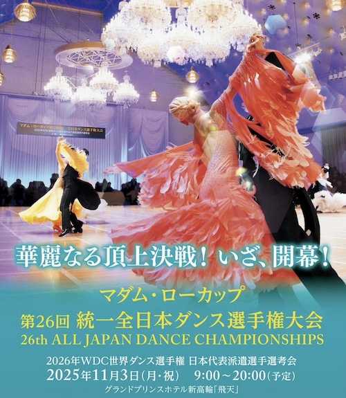 NDCJ主催マダム・ローカップ第26回統一全日本ダンス選手権大会が、グランドプリンスホテル新高輪(飛天)で2025年11月3日(祝日)に開催されました。2026年WDC世界ダンス選手権大会の、日本代表派遣選手選考会を兼ねています。結果は以下のとおりでした。<ボールルーム> エントリー131組優勝 福田 裕一・エリザベス グレイ第2位 金野 哲也・井之口 香織第3位 廣島 悠仁・大西 咲菜第4位 景山 雄紀・和田 有可第5位 小林 恒路・赤沼 美帆第6位 山本 千博・大吉 優華----------------準決勝----------------大西 亘・大西 ちかる室伏 宏明・室伏 彩福田 健一郎・深井 千浩島田 寛隆・村松 明香若代 愼・ 辰巳 友莉亜アングル 相貴・菊田 和嘉子審判は、天野博文、海宝真理、児玉昌子、篠田忠、白幡博之、臼井恵、尚和由里子、Victor Fung、Alex Houの9名です。日本インターの覇者、そして世界選手権でも決勝入りの福田・グレイ組が2連覇でした。金野・井之口 組、日本代表おめでとうございます!!三笠宮杯で優勝した廣島・大西組が3位に入りました。JDSFのPDでも統一戦は参加できるんですね。知りませんでした。<ラテンアメリカン> エントリー114組優勝 野村 直人・山﨑 かりん第2位 竹内 大夢・中島 由貴第3位 八谷 和樹・皆川 円第4位 鈴木 佑哉・原田 彩華第5位 松岡 孝宣・三橋 櫻第6位 髙野 大樹・加藤 奈々----------------準決勝----------------服部 一眞・牧野 果礼 小谷 周平・髙栁 泉中村 公紀・大塩 香澄岡本 圭祐・塚越 あみ鈴木 勇人・高辻 なつみ関 勇人・長谷川 真希審判は、山本千恵子、尾熊淳子、中泉繁、二ッ森司、嶺岸恭子、中村俊彦、長井一平、ibeke Toft、Ning Luの9名です。野村・山﨑組は4連覇です。今年の世界選手権でも決勝入りでした。去年2位だった八谷・皆川 組が3位で、2位に浮上した竹内・中島 組が来年の日本代表です。樋口暢哉・柴田早綾香組の引退デモンストレーションがありました。シラバスはこちら、詳しい採点結果は下記でご覧になれます。ボールルーム部門 ラテンアメリカン部門去年の結果はこちらです。一昨年の結果はこちらです。11月17日までライブ配信のアーカイブ購入ができます。競技会情報はこちらから