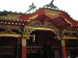 言問通りを下り、根津神社へ。ちょうどつつじまつりを開催中で平日にもかかわらずとてもにぎやかでした。ちょうど2時から森村宣永画伯奉納の三十六歌仙画の特別拝観があり、300円也を支払い昇殿します。ここの社殿の中には、一度入ってみたかったのでいいタイミングでした。(実を言うと40数年前の七五三の時以来なのです。)宮司さんのお払いを受けたあと、社殿内部の自由見学。長押の豪華な透かし彫りやきらびやかな天井が印象的。肝心の三十六歌仙、きれいなかな文字が読めずに、誰が誰だか分かりません。小野小町だけは判読できました。かなの勉強も必要だなぁと痛感しました。そのあと、宮司さんから根津神社の由来の説明。ちょうど今年が、この地に建てられて300年に当たるとのこと。神仏混合で社殿内部にもお寺を表わす「卍」の印や、神社には使われないバクの彫り物が柱にあるとのこと。今日は普段は開いていない、中陣の扉まで開いていてラッキーだとのことでしたが、階(きざはし)の向こうの黒い扉が開いていて、供物が備えられているのが見えただけでした。柱の上の獏と獅子↓境内のつつじ苑は、そろそろ見頃になりつつあるという具合でした。↓