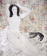 皆さんのブログで藤田展の評判が鰻登りで、矢も盾もたまらず、午前中の会議の後、有休を取って近代美術館まで出かけました。かなりの混雑は覚悟していましたが、まぁさほどストレスを感じることなく、何とか自分のペースで鑑賞することができる程度だったので一安心。雨のせいだったかもしれません。藤田の絵は断片的にはあちこちの美術館で見るのですが、今回の展覧会ではていねいに時代を追って展示してあるので、びっくりするくらいの画風の変化の様子をダイレクトに味わうことができました。藤田というと乳白色の絵という固定観念があって、中南米時代の激しい色使いの作品や日本情緒豊かな作品、晩年の子どもや宗教画の絵など、初めて知る画風の作品で、彼の新しい発見がありました。やはり私のお気に入りも、多くの方々がおっしゃる通りあの磁器の表面のような「すばらしき乳白色」を描いた30台後半から40代初めの頃の絵です。展覧会では「裸婦の世界」というコーナーにまとめられていました。白く塗られた下地の上に、面相筆で墨の黒い絶妙な輪郭線を描き、薄く塗られた微妙な色合いの裸婦の白い肌。絵の具のタッチが分からないのでまさに輝く磁器のよう。逆に衣服や、背景のカーテンなどに描かれた模様の細かさ、鮮やかさ、リアルさには目を奪われます。当然、あの猫ちゃんにも。「すばらしき乳白色」に達する以前の作品では、栃木県立美術館所蔵の「花を持つ少女」。卵形の白い顔。アンバランスな目鼻立ち。晩年の子どもの顔にも通ずるところがある不思議な味わいの人物像。美から醜へと転換する一歩手前の美しさとでもいう感じの絵だと思いました。こういう雰囲気の絵、大好きです。ひろしま美術館所蔵の宗教画、「十字架降下」。琳派の装飾画のような金箔を背景に、手足から黒い血を流すイエスの遺体と涙を流す二人のマリアを描いた絵。晩年のごちゃごちゃした宗教画に比べ、シンプルで悲しみが直截的に胸に迫ってきます。劇的に鮮やかな色調の絵に変わった中南米時代の絵では、京都国立近代美術館蔵の「メキシコにおけるマドレーヌ」がよかったです。白い帽子とドレスの女性、赤い花の模様が鮮やかです。背景は巨大なサボテンと小さな洋館。夜の雰囲気が何とも言えず、幻想的な魅力に溢れた絵です。戦後の絵では、動物宴のような不思議な雰囲気の作品がいい。衣服を着た動物たちが魚や野菜の載ったテーブルを囲んでいる。童話の挿絵のように楽しい絵です。この絵の額縁もグローブや三角定規、卓球のラケットなど、子どもの使う道具のレリーフが彫られており味わい深い。藤田が自ら彫ったものだそうです。目のつりあがった白い顔の子どもの絵。かわいくも見え、逆にそうでないようにも見えます。ちょっと小ずるそうな感じもします。子どもの世界のズルさ、汚さなども全てそのまま引き受けて、それでも子どもが好きという藤田の気持ちが伝わる感じがしました。晩年の宗教画は、洗礼を受けレオナール藤田とクリスチャンネームを持ってからの作品。ダリの描くそれのようで細部までびっしりと描きこまれたハデハデの絵。藤田がこのような宗教画を描いていたことはまったく知らなかったので驚きました。いずれにしても、藤田という画家の生涯を概観でき、その思いを知ることができる貴重な展覧会。今年のベスト3に入ることでしょう。チケットをくださった図書館のKさん、ありがとうございました。高島屋の浅井忠展には藤田を見た後、寄ろうかとも思ったのですが、近代美術館に閉館までいたため、結局行かないまま展覧会が終わってしまいました。ごめんなさい。(4/11)