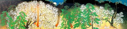 つつじが咲くようになって、今さらながらですが、山種美術館の桜さくらサクラ展に出かけました。大観の「夜桜」を併せて見ようとあえて、千鳥が淵の桜の季節をずらしました。大倉集古館で見ようかどうか迷ったのですが、やはり山種で、ほかの桜の絵と一緒に見て、そのスケールの大きさを再確認できて良かったです。この「夜桜」。昨年は補修中で見ることができなかったので、楽しみにしてました。さすがに大観、絵の中に強烈な迫力と気合、厳しさを感じます。そして、アンバランスな大きさの桜と松。いくつものかがり真っ赤な炎と立ち昇る煙。黒い山とかがり火で照らされた明るい部分の金色の地。群青の空と白金の月。そんな対比を見ているうちに、夢と現を行き来して自分の存在があやふやになってくるようでした。石田武の「千鳥ヶ淵」↑は、本当に少し前の千鳥が淵、そのまんま。「吉野」も写実的ながら、延々とつながる桜色のグラデーションにうっとりです。奥田元宋の「奥入瀬<春>」↑。2m×5mの大作。あたかも目の前にあるような新緑の光景。山桜のピンクの方がワンポイントになっている。川の流れが清清しく、生きる希望がわいてくるような絵でした。同じく奥田元宋の「湖畔春耀」。にしきの織物のような色調に時の経つのを忘れます。小林古径の「清姫入相桜」↑。これもいいです。ひっそりとただ一本、咲いて散る桜。物語の終末。「完」のイメージ。道成寺伝説、いつも思うのですが、清姫って恐るべきストーカーですよね。嘘をついた安珍が悪いのかもしれませんが、それにしても焼き殺しちゃうなんてひどい。まぁ、そんなこと言っては、身も蓋もありませんが。御舟の「春の宵」↑。墨の美しさを、実感しました。最後にもうひとつ。小茂田青樹の「春庭」↑。この画家は初めて知りました。左下の椿はリアルな現実の世界。画面奥まで続く、桜の花散る細い道は、幻の別の世界への入り口のようです。味わい絶品。その他、どの作品も傑作中の傑作で、見応え充分でした。この展覧会。5月7日までの開催です。