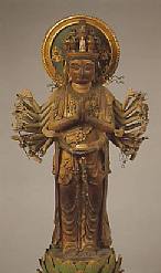 この展覧会、とても見応えのある内容だった。9時半少し過ぎに平成館に向かうが、それでもかなりの人。大学生の団体がいるためだろうか。天台宗についての知識もほとんど無いのだが、法華経、密教、浄土信仰などなどが結びついた万人受けを目指す仏教なのではという印象。最初の書、書付、仏具などは国宝多数だが、よく分からないので少々退屈。最澄の直筆といっても、こんなものかぁとまったく価値が理解できないダメな自分。走るように去っていった大学生たちの気持ちも分かる。そんな中で、目が覚めたのは、福島の龍興寺所蔵の国宝「一字蓮台法華経」。お経の一文字一文字が青、赤、緑と次々と色を違えて描かれた蓮の葉の台に乗っている。やさしくも、きりっとした字と蓮台の美しさに目と心を奪われた。いいものを見たなぁと大満足。(4/16までの展示)さてお目当ての仏像コーナー。ここは一体一体コメントしたいところだが、気に入った何点かについて述べる。まず延暦寺の千手観音菩薩立像。彫りの深い四角い顔つきはユーモラスでさえある。腕の部分も含めて、一木から掘り出されており、その細かさに圧倒される。かなり小さいのだが、重厚感に満ち溢れている。蓮台の緑と金色が色鮮やかだが、後補らしい。同じく延暦寺の聖観音菩薩立像。信長の焼き討ちから奇跡的に救出されたとのこと。こちらは逆に蓮華を一本持っただけのシンプルさが美しい。すっきりとした立ち姿に何ともいえない素敵なお顔。愛知・瀧山寺蔵の運慶・湛慶作梵天立像、帝釈天立像の二体。彩色は後補なのだが、それが仏像というよりどこかで見た人形のようになまめかしい。仏像の作られた当時の様子がよく分かり感激。↓梵天立像。岐阜・横蔵寺の大日如来。木地がすっきりと現れているなで肩のお姿。智挙印を結ぶバランス感覚が見事。大分・大山寺の普賢延命菩薩坐像。八頭+四頭=十二頭の象の上に乗る。とてもメイド・イン・ジャパンの仏像とは思えない。五十年に一度しか公開されないという秘仏、滋賀・善水寺の薬師如来。ずんぐりむっくり、ゆったりとした感じが見るものの心を落ち着かせる。さすが秘仏だけあって、金箔がかなり残っている。逆に広島・耕三寺の快慶作宝冠阿弥陀如来坐像は落剥が激しい。大好きな高野山の孔雀明王像と同時期の作品ということ。もう少し金箔、彩色が残っていればなぁと残念に思う。・・・ふうっ~仏像のコメントはここまで。To be continued.