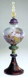 「ガレ」の作品はあちこちの美術館や展覧会で何回も見ているはずなのに、どうもこの人の名前を聞くとまたかと思いながらも、吸い寄せられてしまうのです。今回は、エルミタージュ美術館所蔵の名品が来ているということで楽しみに出かけました。期待に違わず、すばらしい作品ばかりで、「もの」を見る楽しみを充分に味わうことができました。会場のあちこちからで「すごい!」「きれい!」などの言葉が飛び交っていました。とにかく、今回の展覧会でもほとんどが、360度ぐるっと回って見ることができるので、光の移り変わりによって、変化する様子を楽しむことが出来ます。特に最後のコーナーに展示してあった、ティファニーの花瓶は玉虫色に輝くし、ラリックのバッカスの巫女という花器は女性像がブルーやオレンジにみごとに変化します。写真では絶対に味わえない「なま」の魅力ですね。ガレのコーナーにたどり着く前の「アール・ヌーボーの胎動」のコーナーの作品から息を飲むほど素敵なものばかりです。特に矢車草のエナメル彩色をした「双耳壷」と野ばらと蝶をデザインしたブルーの「野バラ文花器」がすばらしかった。ガレのコーナーでは、やはりトケイソウをデザインした花器が傑出していました。触るとペコッと凹みそうな感じの扁平な瓶に配置された時計草。2回目の出会いですが、いつ見てもうっとりです。時計草がキリストの受難を表わしているということで、下の台も茨やキリストの流した血に思えました。ガレの作品は、カエルやトンボの小動物とかシダの葉っぱとか、人間が世の中に出現する以前の太古の昔の光景、恐竜が登場するような時代を思い起こさせます。そのため、少々暗く重々しい感じのする作品も多いですが、そんな中にも、必ずいくつかは、明るくスコーンと飛びぬけているような作品もあったりして、嬉しく思うのです。今回は湖の上にアイリスが咲き、トンボが飛んでいる「湖水文花器」がそんな感じでした。ドーム兄弟のチューリップ文花器のピンクも落ち着いた感じで素敵でした。さらにその口辺のブルーに輝く様子にうっとりと見とれてしまいました。とにかく、写真でいくら見ていても、実際に光り輝いているさまは分かりません。ぜひ自分の目で確認することをお勧めします。