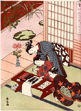 東博の今月の浮世絵コーナー。9月ということもあって重陽の節句、菊の花にちなんだ作品が多い。先日、太田記念美術館で、ベルギーロイヤルコレクションの摺りの美しい春信作品を見たばかりであるが、今回、東博で出展されている春信の作品も美しい色が残っている。太田では、「五常 義」を見たばかりであるが、東博に出ているのは「五常 智」である。娘さんの習字の稽古風景。書かれた文字は真っ黒になっていて、ほほえましい。縁側に活けられた一輪の菊花がアクセントとなっている。そして、「見立菊慈童」は、すばらしい。太田で見た「めだかとり」の流れる川の描写もそうであったが、そよそよ、さわさわと流れる水の音が聞こえるようだ。特に「菊慈童」の方は最後が小さな瀧になっていて、水の流れが変化するさまに見とれてしまう。菊を手折る娘の手の華麗なこと。単純ではあるが、夢のような光景だ。一階の近代美術のコーナーには、平櫛田中の彫刻「烏有先生像」があった。先日、出光で見た「張果像」同様、やはり顔の凹凸が特徴である。こちらは彩色されていなかった。もう一枚、二階の屏風と襖絵のコーナーにある久隅守景の国宝「納涼図屏風」。この絵は何度見てもいい。ほのぼのと平和な気持ちにどっぷりと浸れる。こういう幸せな一時を永遠に残す「絵」って、やはりすばらしいと感じる。