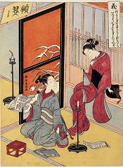 もうすでに何人かのブロガーさんは出かけられているが、ようやく私も見に行く時間が出来た。開館時間の10時半前にはすでに10人ほど並んでいたが、はじめて来られた方が多いようで、畳に上って肉筆画を眺めているので、こちらはさっそく、春信のコーナーへ移動。どの作品もじっくり眺めることができたが、11時半を廻ると結構な混雑となっていた。さて、後期の春信もステキな発色。「洗濯」の物干し棹に挿された洗濯物はきれいな空摺りになっており、ふわふわっとした感触が伝わる。「五常 信」は、琵琶湖の月を見る紫式部。絵の背景が分かってくると楽しい。二階では王立図書館蔵の春信も楽しめる。(柿本人麻呂)2階で興味深かったのは、勝川春潮の大判5枚続き「藤棚下扁額奉納行列」。一枚にざっと10人づつ、合計50人あまりの行列。所狭しと美人が並ぶ。(男もいるが)鳥居清長ばりの迫力。鳥文斎栄之の「浮世源氏八景 浮舟暮雪 橋姫夕照」の2枚続きもいい。栄之の上品な美人画を楽しめる。鳥居清長の息子の清政の「江戸紫娘道成寺 岩井半四郎」も黄色い烏帽子が美しい。豊かな頬をした顔が印象的。清長伜と落款が入っているのも面白い。国芳の金魚づくし。前期に続いて見応えあり。「百ものがたり」の猫に睨まれた金魚たち。勇ましく戦おうとする姿がほほえましい。国芳もう一枚。「東都名所かすみが関」。東博でも見たことがあるが、この絵は大好きである。坂のてっぺんで向こうから来る人とこちらから行く人が行き交う。スコーンと抜けた青空がさわやか。広重の「富士三十六景 駿河薩タ之海上」も好きな一枚。三保の松原が舞台。北斎の「神奈川沖浪裏」へのオマージュだろうか。次回の京都高島屋はムリとしても、来年の日本橋高島屋が楽しみ。