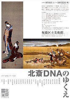 練馬区美術館から地下鉄成増経由で板橋区美術館へと廻る。副都心線が出来て、一段と便利になった。北斎と弟子たちの肉筆画を集め、弟子たちの北斎度を味わってみようという企画。弟子のそれぞれの絵に北斎DNA度○%と表示され、楽しめた。北斎の亜流もいるし、まったく影響を受けていない弟子もいて面白い。はじめて名前を知る弟子もいた。北斎の作品も15点出展されており、これだけでも見応え十分。後期は5点が入れ替わる。三の丸尚蔵館の「西瓜図」は有名。干された薄く切った西瓜の皮が、生き物のようにくねくねとしているのが、気持ち悪くもある迫真の描写である。西新井大師にある「弘法大師修法図」は、鬼と戦う弘法大師の迫力十分の巨大な絵。本邦初公開の「天神図」は、端整な顔立ちの菅原道真。顔の陰影もはっきりとしていて美しい。「拷問の図」は、鬼気迫る。手足を縛られた裸の女性が、天井に吊るされ火あぶりを受けている。そこに塩をなすりこむ異国風の男。危ない絵だ。MOA美術館の「粟に鷹図」は、逆に美しい一枚。鷹に狙われる小鳥たち。レモン色の小鳥が飛んでいる。背景の粟の実の黄色もいいアクセントである。弟子の作品で面白かったのは、抱亭五清という門人の絵。はじめて見た。妙に色っぽい顔立ちの女たち。「粧い美人図」は、ろうけつ染めで、着物と背景の萩草の色が抜かれているという一風変わった作品。もう一人、安田雷洲という画家。「赤穂義士報讐図」は、吉良上野介の首を検分する赤穂義士たち。聖書の「羊飼いの礼拝」の構図を真似て描いたとのことで、とても日本画とは思えない一風変わった作品。とにかく幼子イエスが吉良の生首に変えられているのだから凄い。一見の価値があると思う。鑑賞後は、展示室前の広間で、谷中琵琶スタイルの琵琶コンサート。琵琶の音色が、ベーンベーンと心に沁みる。とても「濃い」板橋区立美術館での体験であった。