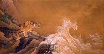 出かけよう出かけようと思っていたこの展覧会。我が家からのロケーションは便利なところなのだが、かえってなかなか出かけないものなのだ。ましてや以前の若冲のように強烈な誘引が無ければなおさらだ。この日はたまたま、パレスホテル横の噴水公園レストランで、友人の結婚式があったので、いいチャンスとばかりに赴いた。和田倉噴水公園レストランの方は、噴水を背景に、開放感いっぱいで、なかなか快適なところだった。丹下健三設計だとのこと。さて、三の丸尚蔵館。橋本雅邦の「龍虎図」。威風堂々とはっきりと描かれた虎に対して、龍のほうは雲の彼方にうっすらと。逆巻く白波が第三の生き物のようだ。海野勝みんの彫金「太平楽置物」「蘭陵王置物」。小さいながらも、重厚感に溢れる作品。この間、清水三年坂美術館で特集展示されていた工芸家である。反対側の展示ケースを眺めると、金色に輝く花鳥図が見えた。漆喰か何かで作ってあるのかと思い、近づいて見ると何と刺繍の屏風であった。高島屋のオーナーだった飯田新七が作った「四季草花図刺繍屏風」である。このゴージャス感は、たまらない。絵よりも立体的で重厚である。高島屋が呉服問屋から始まったということもはじめて知った。明治の工芸家にも、がぜん、興味が沸いてきた。