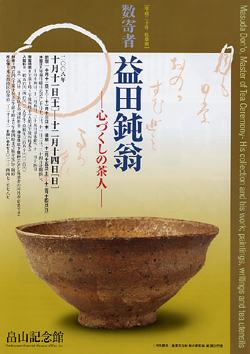 お茶をかじっているのにも関わらず、森川如春庵やら鈍翁・即翁やらを、つい最近知ったばかり。天下の名物を金にあかせて買いまくった人という印象があるのだが、やはり、皆、それなりの大人物であったらしい。まずは、朝鮮伝来の名碗、柿の蔕(へた)茶碗をじっくりと眺める。「毘沙門堂」といういかつい銘がついている。焼き締めのこういうゴツゴツ感がたまらない。茶筅の振り応えがあり、美味しいお茶が点てられそうだ。鈍翁と即翁のエピソードには、あまり感心が沸かず。所詮金持ちの・・・と貧乏人根性の反発心が沸く。以前、京博で「福富草紙」を見たことがあるが、それを元に鳥獣戯画風に動物を主人公にして、鈍翁の放屁にまつわるエピソードを描いた「ふき富草紙」には笑ってしまう。サントリー美術館で見た「放屁合戦絵巻」とか、この手の話は大好きだ。けふこそとおもひをこめし甲斐もなくただ一発で これもお茶番しかし、屁なりとあだなるものとおもふなよブツトいふ字は佛なりけり畠山記念館の中庭。紅葉が雨に濡れ、味わい深かった。