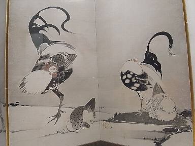 毎年恒例の博物館に初詣。江戸絵画のコーナーで、若冲の「松梅群鶏図屏風」に出会う。東博にこんな作品があったとは知らなかったので嬉しい。この手のマンガチックなニワトリは、何度か見ているが、点描の灯篭と組み合わせて描いているところが面白い。隣の「雪中棕櫚図」もてっきり若冲かと思ったら、門弟の秦意冲のもの。粘着質の雪の表現などそっくりである。応挙の「雪中老松図」は、三井記念美術館の「国宝雪松図屏風」の一部分を切り取ったような感じの絵。三井を意識して出展しているのかも。岩佐又兵衛の「羅浮仙」。他の画家の描くようには、艶かしくはないが、豊頬長頤の又兵衛らしさがよく分かる。浮世絵のコーナーには、珍しく春信や歌麿の作品がひとつも無い。鳥文斎栄之の「風流五節句・元旦」で満足することにする。