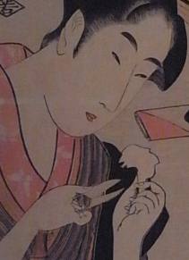 今回の東博の浮世絵コーナーに春信と歌麿がもどってきた。やはりこの二人の作品がないと浮世絵を見た感じがしない。春信は「見立半托迦」。美人の持つ茶碗から龍が飛び出す。多分、暦になっているのだろうと推測したのだが分からなかった。とらさんのブログを拝見して、やはりそうだったかと納得した。歌麿は嬉しいことに「洗張り」「針仕事」「押絵師」の3枚の「婦人手業拾二工」と中央の平面展示台に3枚続きの「針仕事」と都合6枚、出展されている。今回は女性の仕事シリーズ。はさみを持つ美女の指先の細かな表情など、さすが歌麿。最近、ちょっとお気に入りの菊川英山。「風流雪ノ遊」の3枚続。英泉らの退廃的な美人像に移行する少し前のちょっと上品な美人。歌麿、栄之らの洗練された美人からちょっと(危ない方向へ)趣が変ったところが好きだ。そして、もうひとりのお気に入り。礒田湖龍斎。昨年、太田のベルギー展や江戸博のボストン展で見た「雛形若菜初模様」からすっかり嵌まってしまったのだ。しかし今回は、美人よりも犬。「水仙に群狗」の子犬たち、可愛すぎる。(今回の展示は2/8まで)