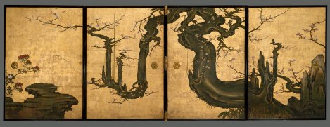 オープン2日目。平日の午後なのにかなりの入り。ところが、前半の大部分を占める第1章から第3章は、ほとんど、古文書、消息、お坊さんの絵(頂相)、墨蹟などで、さっぱり面白くない。皆さんは、最初からご丁寧に解説を読んでいるが、ここは横目で眺めながら先へと進む。面白くなってくるのは、第1会場の最後、第4章「禅の空間1―唐絵と中世水墨画―」あたりから。伝狩野正信の「鍾呂伝道図」。呂洞賓に仙人の術を授ける鍾離権の図。やっと分かりやすい絵が現われて一安心。ちょっと不気味な十六羅漢図も面白い狩野元信と伝相阿弥の瀟湘(しょう しょう)八景図をじっくりと眺め、第2会場へ。入り口に、秀吉と淀姫の息子豊臣棄丸(鶴丸)が乗って遊んだ船「玩具船」がある。そして、本当にかわいい美しい鎧がある。わずか3つで亡くなってしまったのかと思うといっそう哀しい。武人像の中に、蕭白の描いた福島正則像がある。これはもう人というより、「トラ」の顔のようだ。次は、白隠和尚の特集。このあたりはもう見慣れているので楽しみながら廻る。そして圧巻は、最後の第8章禅の空間2―近世障屏画の輝き―のコーナー。長谷川等伯の「枯木猿猴図」。あの国宝松林図屏風も連想する粗く大胆なタッチ。猿の毛並みも硬い細い線を重ねているのだが、これが上手い。リアルではないのだが、雰囲気は抜群。さて、ラストは目にも鮮やかな屏風の数々。特にメトロポリタン美術館からやってきた、狩野山雪の「老梅図襖」には、釘付けになってしまう。先日、夢の美術館「江戸の名画100選」でも放映されたばかり。梅の老木は、もはや樹木ではなく、のたうちまわる龍のようである。石も同様。どこまでも増殖していくようだ。紅白のツツジを眺めて、どうにか冷静さが戻ってくる。この一枚を見るため、東博に通っても惜しくはない。もう一度、第1会場を廻ったが、やはり前半は「・・・」という感じであった。