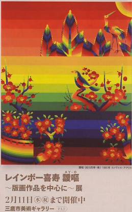 とにかく、靉嘔の作品は楽しい。無条件で心が温まり、幸福な気分になる。昔々、高校生の頃か大学生の頃、津田沼パルコにあった画材店で靉嘔(あいおう)のリトグラフが売られていた。何を題材にしたものか忘れたが、一目見たときから、レインボーカラーの作品に釘付けになった。いったい何色で表現されているのだろうと、ひとつの層ごと数えた記憶がある。それ以来、この珍しい作家の名前を覚え、ファンとなった。エディションナンバー、サイン入りでも、今だったらちょっとした飲み会一回分くらいの値段であったが、当時の自分でも、ちょっと無理すれば買えたと思うのだが、いつか、いつかと思っているうちに、もう何十年も経ってしまった。この77歳を迎える靉嘔の喜寿を祝う展覧会、アンリ・ルソーの作品を虹色で再現したものや花札のモチーフを表したものなど、見ていて楽しくてたまらない。地獄・極楽図もあるが、こんなレインボーカラーに彩られた地獄なら、どんな責め苦もかえって心地よいかもしれない~BLACK HOLE(右)などの抽象画は、見ていると絵の中に吸い込まれそうに感じたり、絵と一緒に揺らいだりしているような気分になってくる。これもまた楽しい。この日、ご本人によるギャラリートークが、急病により中止になった。心配である。まだまだ喜寿。今後も、お元気で活躍してもらいたい。(1/17)