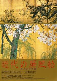京都画壇の木島桜谷(このしまおうこく)の屏風を中心に明治大正時代の華麗な屏風を展示。併せて江戸時代の屏風も展示。何せあの狭い空間なので、屏風は合計10点程度しかない。木島桜谷という画家は、はじめて知ったのだが、まさに琳派。光琳、抱一、其一へのオマージュ。燕子花図なんか、光琳そのまんま。「竹林白鶴」の竹林を流れる小川~にわたずみ?~のギザギザが心地良い。望月玉泉という画家もはじめて知った。京都画壇で明治を代表する画家とのこと。川合玉堂の師匠。その代表作の「雪中芦雁図」が展示されている。自由闊達な雰囲気が好き。息子の望月玉渓の「夏冬之図」が気に入った。2曲1双の屏風。左右の正方形の画面に描かれた夏冬の対比がよい。雪中なのに鴨やオシドリが群れていて賑やさを感じる冬に対して、山奥の滝や緑の木の上の鷹?が描かれた夏は深山の静けさを感じる。もう一点、香田勝太という画家の屏風。「春秋草花」。何か雰囲気が違うなと思ったら、油絵だった。盛りを少し過ぎた菊の花々のしっとりとした落ち着き。寂しさも感じる。特別出品で、江戸時代の画家、彭城百川(さかき ひゃくせん)の梅図屏風があった。金地に荒々しいタッチの墨で描かれた紅白梅図屏風。白黒の水墨画なのに紅梅、白梅だとすぐに分かる。水墨画っていいなぁと思った次第。(チラシの上の絵)前期は2月8日まで。後期は2月10日から、ほとんどの作品の展示替え。