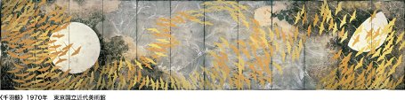 衝撃の体験だった。加山又造の絵は、竹橋や他の展覧会で断片的には見ていたのだが、これだけまとまって見たのははじめてだった。花鳥風月の屏風絵、琳派風の装飾画、動物たち、裸婦、水墨画と展覧会場のコーナーを廻るたびにオオッとかウ~ンとかワォなどと思わず声を発してしまいそうになった。それぞれのコーナーが新しい体験。衝撃の連続といった具合だった。動物画、シュルレアリスムやロスコー洞窟の壁画などの影響を受けているとのこと。装飾的な規則正しい模様の背景の前にたたずむ動物たち。私はエルンストの世界を連想した。1957年の「冬」という作品。白い枯れ枝にとまる黒いカラス。痺れてしまった。琳派風の屏風。国立近代美術館でおなじみの「春秋波濤」はもとよりすばらしい。秋草が咲き虫たちの鳴く緑の大地、青海波の波濤、金銀の箔を散らした天の川という3つの面で構成された「天の川」という屏風。具象と抽象と装飾の入り混じった絵だ。もうため息しか出ない。裸婦像のコーナーは今ひとつだったが、次の花鳥画のコーナーでは、再び華麗な世界に目を見張る。武蔵野図屏風を元に描いたと思われる「秋草」など、あまりにも美しく、そして哀しくてたまらない気持ちになる。水墨画のコーナーでは、もう言葉も出なかった。ただ立ちつくすのみ。キャプションに色彩を越えた「色」とあるが、まさにその通り。「水墨山水図」は長谷川等伯の松林図をイメージして描いたのだろうか。こんなにビビットな水墨画は、かつて見たことがない。今回、加山が、カラーメゾチントの版画なども作っていたのを知って驚いた。紙に封じ込められた色彩が鈍く輝いている。今年のベスト10に入る展覧会に早くも出会えて、嬉しくてたまらない。