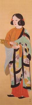 とらさんがおっしゃるように、水墨画のあとにカラーズというのはウィットあふれる展覧会だと思う。靉嘔(あいおう)のレインボーカラーの油絵に出迎えられ、水墨画を見て神経をとぎすまされるような気持ちから、急に暖かな気分に切り替わる。他の現代アートの作家たちは、知らない人が多く、そこそこに眺めていたのだが、浮世絵が登場するようになってからは、俄然、おもしろくなってくる。明治の浮世絵師豊原国周のどぎついアニリンの赤なぞを見ていると、当時の人が安価に自由に使える赤色に狂喜した様子が目に浮かぶ。そんな中でも月岡芳年の綿密に構成された極彩色は見事のひとこと。さて、第3部を眺めていて、「阿蘭陀土産」という作品に出会った。(画像はとらさんのところから無断拝借です。スミマセン)横尾芳月という日本画家が大正15年に描いた美人画だ。画面全体が赤く染まるように南蛮屏風や絨毯、打ちかけが描かれている。大きな髷の女性は、美しいのひとこと。大名時計が印象に残る。その妖しく艶とした表情にじっと見とれてしまう。調べるとこの作品は帝展に初入選した作品だとのこと。おまけに横尾芳月は、晩年、千葉市に在住しており、つい先月まで千葉県立美術館で展覧会が開かれていたとのこと。千葉県立美術館、まったくPR不足だ。もっと、大々的に宣伝してよ。(まぁ、予算を考えれば仕方ないのだろうが・・・)隣の小早川清の「赤いドレス」も美しい。昭和初期のレトロな雰囲気がぷんぷん。先月、東京都美術館で見た菊池契月の絵にしろ、この時代の美人画は独特な雰囲気があって大好きである。