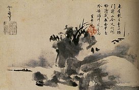 日本の水墨画の歴史をたどる展覧会。山水画から人物画、花鳥画。そして、文人画・禅画など水墨画の魅力満載。出展数も41点とさほど多くないのだが、見応え十分な展覧会だった。ほとんどの作品が彩色されてなく、黒と白の世界が続くのだが、決して不自然ではなく、当たり前のように眺めている。まずは、雪舟の「破墨山水図」から。輪郭線のない、大雑把な面で描かれた光景。今年の正月に千葉市美術館で「雪舟と水墨画展」を見ていたので、既視感を覚える。(この作品ではなかったが。)千葉市美術館で見たときは、このような輪郭線の無い「もわっ~」としたタイプの絵は好きになれなかったのだが、今回は最初に展示されていたせいか、気力十分。じっくり見ているうちに、船とか人とか、家々とかいろんなものが見えてきて、それが実に面白い。単純だが深い絵であると感じた。「武陵桃源・李白観瀑図」(岳翁蔵丘)は、ステキである。縦長の掛け軸2対。どちらも有名なシチュエーションである。落差の大きい滝を眺める李白と弟子の姿が面白い。また、桃源郷の岩山の桃の花のピンクがモノクロの世界の中でも自然に感じられる。能阿弥の「四季花鳥図屏風」。この絵が、年期が記入されている作品の中では日本最古の花鳥図とのこと。1469年応仁3年とある。すぐに「人の世空し、応仁の乱」と思い浮かぶ。この絵が描かれた京都は戦乱の時代だったのだ。それに反して、絵の中は実に平和な世界。さて、チラシにもなっている長谷川等伯の「竹虎図屏風」。普通、虎は龍と描かれ、雌雄の虎というのは、珍しいのだそうだ。左隻の後ろ足で頭をかく虎はかわいい。狩野探幽がこれは周文が描いたものだと間違えているのが面白い。同じく等伯の「竹鶴図屏風」。この濃くそして薄く描かれた竹の表現に、正月に等伯で見る「国宝松林図屏風」を思い出す。武蔵や宗達の水墨画を眺めるが、やはり目は浦上玉堂の絵にくぎ付け。もうすっかり玉堂フリークとなってしまった。きっちりとした筆使いで(皴法・しゅんぽう)描かれた山々。しかしそれはリアルさのかけらもない、全くのイマジネーションの世界。それでいて、深いのである。富岡鉄斎が玉堂へのオマージュで描いた「高士弾琴図」が最後にあり、趣き深かった。