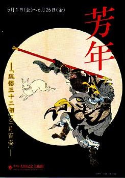 「月百姿」は、月にちなんだ物語や説話を題材にした100枚のシリーズ。芳年の最期の力作の浮世絵である。とらさん同様、私も以前から断片的に見ているのだが、今月・来月と前期後期で合わせて一気に公開というのは、またとないチャンス。先日のukiyoe-tokyoで芳年の二枚続きの名作を眺めているので、我慢ならず、さっそく出かけることにした。太田は相変わらず、外国人のお客が多い。ガイドブックで、日本の観光名所になっているのだろうか。とにかくうるさいのには閉口する。館の人も外国人の方には注意できない。1階は風俗三十二相。2階に上がると月百姿の展示。それぞれ、前期分で、半分ずつの公開。月百姿は、やはり明治の浮世絵であり、ピンクや緑、ライトブルー、そして赤などのカラフルな色遣いが美しい。明治もこの頃になると、赤の色遣いも明治初年のころのようにどぎつくなく洗練されてくる。曹操や武田信玄の衣装の赤など、目に鮮やかであり、それぞれの武将の気魄も感じられる。若い女性の二人連れが「四条納涼」の絵を見て、下着の赤襦袢が「エロい」と言っていたのが印象に残った。「いやらしい<美しい」という感覚だろうか。達磨のオレンジの衣にもハッとするし、笛の名手豊原統秋の緑の着物も爽やかである。「孝女ちか子」は、入水自殺というテーマで好みが分かれると思うが、覚悟の上、凍てつく冬の湖に飛び込むドラマチックな姿には心を打たれる。私は、「松竹梅湯島掛額」の八百屋お七の絵に匹敵する素晴らしさだと密かに思っている。謡曲「熊坂」の刷り上がりの美しさは、何とも言えない。Webの「ONE HUNDRED ASPECTS OF THE MOON」のサイトで月百姿の全編の画像を眺めることができるが、こちらの方と比べてみるとよく分かる。今回の展示は、学芸員の方の分かりやすい解説がついているので、情景の理解もよくできる。今回の図録は絶対に「買い」である。「月百姿」の全作品が掲載されており、解説されている本をやっと手に入れることができた。