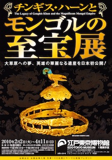 大相撲は大阪で開催中、そのため、両国はひっそりとしている。 どうしても、モンゴルというと不祥事引退した朝青龍や、今場所活躍中の白鵬たちのことを思い起こすのは、場所柄もあって仕方ないか。展示の最初は、モンゴルのいくつかの部族ごとの、遺物の紹介。青銅器や馬の飾り物など、まぁこんなものかと思いながら眺めて回る。遊牧民族の生活を取り上げたいのか、一時期、広大な誇ったことを訴えたいのか、モンゴル史を紹介したいのかなにやら中途半端な展示に感じた。金製工芸品の「黄金のマスク」や、チラシ掲載の「鷹形金冠飾り」と、清の時代の色とりどりの民族衣装の美しさに目を奪われはしたが、あとはさほど印象に残らず。上野の森美術館のチベットの仏像展の強烈な記憶が今でも生々しいために、こちらの方は、今年のその他大勢の展覧会の一つに埋没。それでも繰り返しになるが、「孔雀羽織蟒袍(もうほう)」という龍の刺繍が施された清代の大臣の礼服には見とれてしまったことは事実である。