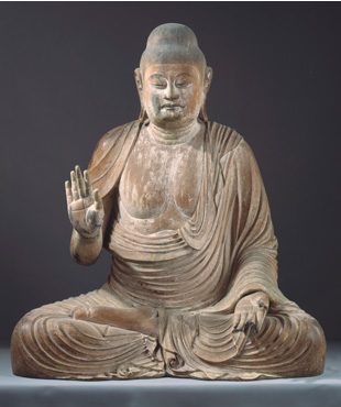 曾津八一のうたにのせてというサブタイトルがついてはいるが、八一の歌や書にはあまり興味が湧かなかった。あの枯れ枝のような堅い書には、あまり惹きつけられない。それよりも、奈良の仏像たちと、日本橋で出会うことが出来る幸せ。どんな仏像が出展されているのか、ほとんど知らずに眺めていただけに、感動の連続。最初の立体展示のコーナーには、観音菩薩など白鳳仏の小品が出迎えてくれる。東博の法隆寺宝物館のミニ版といったイメージ。正歴寺の薬師如来倚像(いぞう)は、イスに腰掛けた東京深大寺にもあるが、日本では珍しい姿の仏像。二重のまぶたに柔和なよきお顔。東大寺と岡寺の菩薩半跏像が並んでいる。2体の菩薩の表情を比べるのも面白い。私はふっくらとした丸顔の岡寺の菩薩の方が好きだ。如庵ケースの八一のコーナーは軽くいなして、次の部屋は、東大寺、西大寺などの仏像を楽しむ。東大寺の鎌倉時代の四天王。とくに下ぶくれの少々マンガチックな持国天が好きだ。腰のくびれもいい感じ。五劫思惟阿弥陀像はお坊ちゃまのような四角いお顔が愛嬌たっぷり。まぁあの螺髪。はじめて見る人はびっくりすると思う。螺髪のつんつんした様は西大寺の塔本四仏像の方がすごいと思う。木くそ漆で盛り上がっているのだろう。4体とも表情のリアルさがいい。最後のコーナー。思わずうなってしまったのは、室生寺の国宝釈迦如来像。室生寺に行っても、暗い堂内で遠くに見えるだけのこの像が、なんと目と鼻の先で拝観できる。この釈迦如来像、こんなに白かったのかぁとまず驚く。そして、足の裏の木目の様子、両胸の木目のようすなどもよくわかるし、足の裏はつやつやと輝いている。さらに仏の指の間の水かき(縵網相)がばっちりと見えるのもすごい。とにかくこの像を見ることができたのは、予想外の大収穫であった。釈迦如来像は7月25日までの展示。