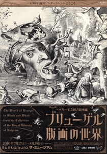 ちらしの「聖アントニウスの誘惑」の奇想天外な光景。近代のシュールレアリスムの画家の絵ではないかと間違うってしまうくらいにステキ。3連休、最後の休日の3時過ぎ。Bunkamuraのチケット売り場にちらほらの人。混んでいるのかなぁと思い、扉をくぐり、怪物たちの姿のパネルを見ながら、会場に入ると、絵の前にずらっと人が並んでいる。というか、最初の絵まで行列していて近づけない。何しろ細かい版画なもので、絵の直前でじっと見入ってしまうからだ。特に音声ガイドを借りている人。これは仕様がないのだが。壁と壁の間にも動かない行列。これはたまらないと、列の後ろから眺めることにする。後半は、やや列も途切れがちで、絵の前に立つこともできたが、それにしても驚いた。みなさん、忍耐強い。若者カップル多し。チラシの効果が大きいのかもしれない。最初は、風景画。雄大なアルプスの山々がすばらしい。このあたりは、落ち着いて見られない作品もあり、残念。再度出直すことにする。ブリューゲルというと油絵のイカロスの失墜を思い起こすのだが、今回も版画が出ている。落ちるイカロス。でも、風景はまったく変わらず。宗教画のコーナーになってくるとまさに異次元世界。チラシの「聖アントニウスの誘惑」「最後の審判」など、もうこれでもかというくらいに、描きこまれた化け物や異形の人々。家畜人ヤプーの世界。ボスの影響が大であることを確認した。有名な「バベルの塔」がある。いつかブリューゲルの油彩を見たい。キリスト教の7つの大罪のコーナー。解説を読むとなるほどと分かるが、絵だけ見ていても迫力満点。私は恥ずかしながら映画の「セブン」で、この主題を知ったのだが、当時の人はこういう絵を日常的に見ながら、生活を道徳化していたのだ。日本の地獄絵と同じ。しかし、背景の建築物も斬新で凝りに凝った形で驚いた。生活の寓意や教訓をテーマにした作品。なるほどと思うものも多し。「大きな魚は小さな魚を食う」は弱肉強食とのこと。裂かれた大きな魚の腹から、デロデロとあふれ出る小さな魚たち。これも現代人の目から見ると少々気色が悪い。でも、当時の人々にとっては、みんな自然なことなんだと改めて実感。帆船のさっそうとした姿が美しい。ここにもイカロスとダイダロス親子の姿や、海神たちの姿が描かれているものもあって楽しかった。後半は列も途切れがちで、自由に移動できたが、4時半過ぎに入り口に戻るとまだまだ長蛇の列であった。
