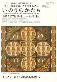 日本橋の三井記念美術館で奈良の仏像を見た後は、表参道の根津美術館に向かう。こちらでは、色鮮やかな仏画が多数出展されている。ふつう、仏画というと退色して姿のはっきりしない仏を描いた掛け軸を思い起こすが、根津には保存状態のよいものが多く驚いた。「金剛界八十一尊曼荼羅」、とにかく、美しい曼陀羅である。この精密な諸仏の配置。緑と赤、仏と草花のハーモニーが抜群である。とても鎌倉時代のものとは思えぬ美しさが残っていて、まるで、最近のチベットの曼荼羅を見ているかのようであった。それ以上に驚いたのが、平安時代の大日如来像である。もともと大日如来は他の如来と違って、宝冠や瓔珞などの飾り物をまとっているのだが、それらが色鮮やかに仏の白い身体を飾っている。800年以上前のものとは思えず、つい最近描かれた仏画のようである。その他、愛染明王像の深紅の身体と羊歯のように渦巻いている火炎の光背の文様に見とれ、赤い日輪の中の獅子の頭に座す大日金輪像にも強く惹かれた。金の唐草紋のある深紅の袈裟をつけた高麗の阿弥陀如来の仏画も名品が多く出展されていた。仏画は仏像と異なり傷みやすく、オリジナルの美しさが無くなると興味を失いがちになるのであるが、久しぶりに美しい仏画を多数眺めることができて、感激した展覧会であった。