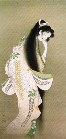 松園の美人画は、どうも真面目すぎ、色気が無い。そして、どこかつかみどころが無く、みな同じ顔に見える。と、あまりよい印象が無かった。例外は、今回展示されている「花がたみ」や「焔」くらいである。ところが、今回の展覧会のように、松園の年代別に並べられた絵を眺めていると、今まで特徴が無いと感じていた松園の絵の雰囲気も、年を経ることによって随分と変わっていくことが理解できた。初期の細面の顔、そして20代の頃のコロコロとした優しい顔。30代になると表情がより生き生きとしはじめ、40代ではそれが絶頂となるが、その後、表情に余分な感情が消え、内に秘めた感情が感じられるようになる。ざっとこんな感じの画風の変遷であろうか。松園は、「焔」で、嫉妬という強烈で究極の感情を描いた後、しばらくスランプに陥り、やがて、同時代の京都画壇の男性画家が描くエロ・グロ風の美人画と一線を画した、清楚で気品にあふれる作品を描き続けたのである。さて、六条御息所の生霊を描いたこの「焔」。週刊上村松園のホームページで山下裕二先生が、左手の表現など曽我蕭白を研究していると述べていた。おかげで、今回、はじめて左手が描かれていることに気がついた。指先を妙にねじっている様子は、なるほど蕭白によく登場する女の手のようである。今回、まとまった松園の作品を見て、ようやく松園の良さが、若干、分かるようになったのが大収穫である。
