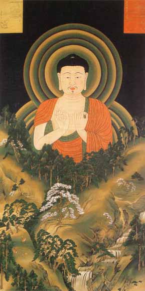 チラシとなっている冷泉為恭の「山越阿弥陀図」。これは大傑作である。絵の下半分は緑の木々の生えた山の中、川が流れ、桜が咲き誇り、鹿が遊ぶ。画面の上半分に朝鮮風の紅い衣をまとった阿弥陀如来がすくっと上半身をのぞかせる。下半分の自然の美しさと上半分の阿弥陀の慈愛に満ちた姿が、上手くコラージュされて、絶妙なバランス感覚にあふれている。「ピュアランドへようこそ」とまさに浄土への誘いというのにふさわしい絵画である。冷泉為恭は、幕末の大和絵師。復古調の絵を描く彼は、長州藩の志士に暗殺された。安政の大獄に加担した酒井家に出入りしたため、狙われたとのこと。この絵も追手を逃れて潜伏している折に描いたそうだ。幕末は一介の絵師まで、命を狙われる恐ろしい時代。目をつけられてしまったという不幸もあるが、有名税というにはあまりにも酷である。そんなことを思いながら、阿弥陀仏を眺める。この絵師はピュアランドへ辿り着くことができたのであろうか。