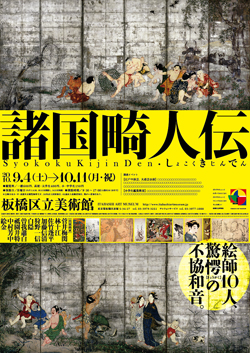江戸時代、全国各地で活躍した菅井梅関、林十江、佐竹蓬平、加藤信清、狩野一信、白隠、曽我蕭白、祇園井特、中村芳中、絵金と全国の十人の絵師の作品を展示している。中には梅関とか蓬平など、馴染みのない名前も見受けられた。絵が売れず不遇の生涯を送った絵師。パロトンがついて大成した絵師などいろいろであるが、それぞれの個性あふれる絵を楽しむことができた。前段で、一癖二癖もあるそれぞれの絵師のエピソードを紹介したあと、展示会場に入る。第1室で目を引くのは、やはり最奥にある曽我蕭白の群童遊戯図屏風だった。柳や昼顔、笹など銀地の屏風に美しく描かれている。牛や燕も墨絵でのんびりと描かれているが、子どもたちの姿はどこか小憎らしい顔つきである。加藤信清の阿弥陀三尊図、出山釈迦図などの文字絵は、以前も見たことがあったが、見るたびに驚く。ベタに塗った彩色のように見えるのだが、実はすべてお経の文字を描いた連続した線で構成されているのには、ただ唖然とするのみ。単眼鏡や双眼鏡を持参してじっくりと見たい。第2室は、正面に絵金の強烈な色彩がまず目に入る。ところが、奥に至るまでの両サイドも強烈な作品の目白押しである。狩野一信の五百羅漢図のコテコテさとおどろおどろしさには目を見張る。不気味な月明かりに照らされ、ひっそりと座禅を組む羅漢たち。また自らの顔の皮を引きはがし、観音の面を出現させる羅漢、海上を歩いて渡ってくる羅漢や動物たち。濃密な色彩により仏の世界というより、SFかホラーといってもよい世界が展開する。となりは、脱力系、へたうま系の白隠和尚の絵。ただ、蓮池観音図は本格的に彩色した絵である。そして、絵金。絵金の現物を見るのは初めてなのでワクワク。描かれた光景にもドキドキする。「浮世柄比翼稲妻」では、手足が飛び散り、頭が転がり、血しぶきが舞う。芳年以上の血みどろさである。それでいて、どこかマンガチックでもあるところが、庶民に受けたのだろう。もうひとり、祇園井特の怪しいどぎつさ。対象が美人であれば、そのままでよいのであるが、そうではない場合でもリアルに描かれてしまう。妥協を許さないリアリティが魅力的である。江戸絵画ファン、垂涎の展覧会である。