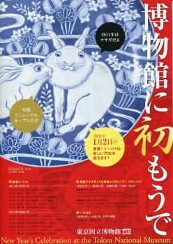 東京国立博物館本館がリニューアルして、パワーアップしたとのこと。東博ファンとしてはどんな具合に変わったのかと楽しみにしていたのだが、一階の漆器や陶磁器、日本刀などの導線を変え、照明を工夫したのみだった。ここは、ここで、雰囲気がぐっと良くなって楽しめたのだが、この勢いを全館の展示に広げて行ってくれればもっともっと素敵なスペースになるのになぁと感じた。このリニューアルを記念して国宝展示室だけではなく、あちらこちらに国宝や重要文化財の名品が展示されている。国宝展示室には、おなじみの雪舟の「秋冬山水図」がある。冬の光景のいつ見ても不思議なこと。この円形の空間はどうなっているのかいまだに分からない。国宝古今和歌集(元永本)を見た。とにかく美しい料紙である。金銀のきらめきに心が躍る。文字は読めないながらも、線の美しさには、うっとりである。永徳の国宝檜図屏風の前にはほとんど人は立ち止まっていないのだが、光琳の風神雷神図屏風の前だけは、大混雑となっている。黒雲のもわもわとしたたらし込みが好きだ。両隣の若冲や又兵衛には、人々は目もくれない。私はこの又兵衛の「羅浮仙」が好きだ。豊頬長頤の独特な表情が、雅やかさを感じさせられる。卯年ということで、ウサギに関わる作品が多数出展されている。飛躍の年ということで、跳ねるウサギは縁起がいい。ウサギには愛着が深い。妹が卯年生まれということで、実家にはウサギグッズがたくさんあったことが、記憶に刷り込まれているためだろう。実際に飼うとかなり獰猛な生き物なのだが。チラシになっている伊万里の染付けの皿。かなり大きな皿であり、おまけに、白いウサギがレリーフのように盛り上がっている野に驚く。絵では、宗達の「兎桔梗図」や広重の「月下木賊に兎」などに地味ながらも名品であり、見とれてしまった。さて、どうやら、この東博の人ごみは、若手女優を使ったポスターの影響であるらしい。その世界には疎いので、誰だかまったく心当たりが無いのだが、光琳の風神雷神図屏風の前で雷神の格好をまねをしているカップルがいた理由がよく分かった。途中、見ているほうが恥ずかしくなるくらい、いちゃいちゃしているカップルも見かけた。美術もファッションになってしまったのかと思って、苦々しい思いであったが、流行がアートを支えるのであるし、辻先生が日本美術は「飾り」の文化だと言っていたのを思い出し、なるほどなぁと自分を納得させた。(1/2)