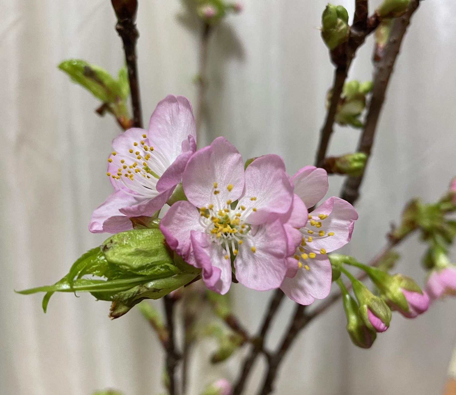 寒い我が家でも外よりは一応暖かいのだろうか笑頑張って咲いた河津桜。あっという間に花の数も増えまして。20輪くらいはあるかなー。まだまだつぼみもたくさんついていてどんどん膨らんできてる感じ。いつも、父には「なにも桜の枝を折らなくっても…」と思ってしまうが笑こうやってしっかり咲いてくれるとありがたく思う。
