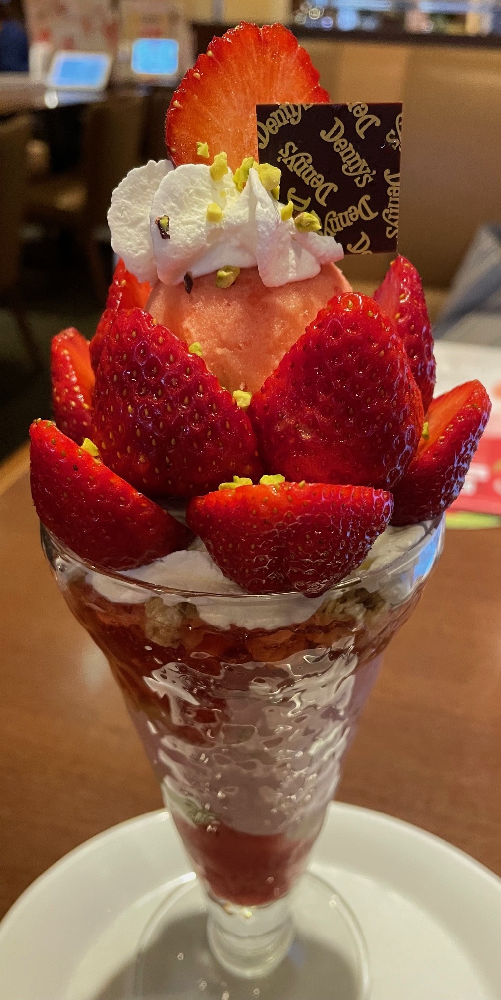 ここ半年くらいずーっとパフェを食べたい、と思っていたんだけどなかなか食べる機会がなくて。かと言って、インスタ映えするみたいな派手な、行列のできるお店のパフェを食べたいとかではなくごくふつうの、並ばなくていいところので全然よくて。…と思っていたところやっとその機会が訪れまして。デニーズで、食べてきました笑間接照明的な感じになっちゃってるけどあまおうのパフェですね。数量限定の、サダハルアオキコラボの。おいしかったんだけどちょっと物足りなかったなー。いちごのシャーベットの下にピスタチオのシャーベット(か、アイス)があるんだけどあんまり合わない気がする。ふつーにバニラアイスの方があまおうの味が引き立つんじゃないかなー。…ま、パティスリーのプロが監修したんだろうからそっちが優先で、私の好みなんか知ったこっちゃない。ということで、近いうちに別のパフェ食べてきます。