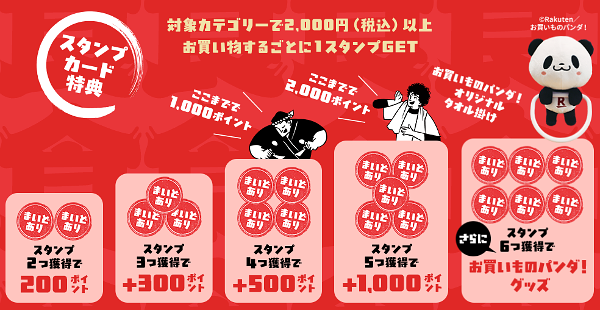- 特設ページまたは会場で商品を購入してスタンプを貯めると「お買いものパンダ」特製グッズや「楽天ポイント」を進呈するスタンプラリー企画を実施