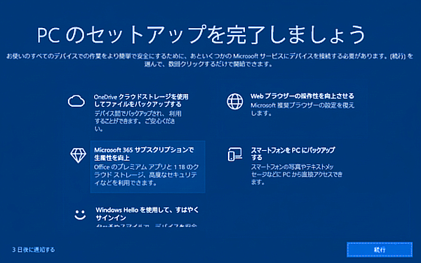 パソコンを起動した時に、頻繁に現れる「デバイスのセットアップを完了しましょう」と催促する通知画面... 「続行」か「3日後に通知する」の2者選択...「今後は通知しない」がない。 仕方なく「3日後に通知する」をクリックの繰り返し。しつこく勧めてくる『Microsoftのサービス』、Googleで間に合っている私には不要。 マイクロソフトの商売も理解出来るので、ガマンしていましたが、"非通知にする設定" は、ココにありました。「PCのセットアップを完了しましょう」を非通知にする鍵マークの「設定」から入って、左上のナビゲーションをクリックするとメニューが開きます。「システム」をクリック。次に「通知」をクリックします。スクロールして下段にある「追加の設定」をクリックします。3つのオプションの[□]のチェックマークをすべて外します。 ※追加の設定なのに、初期設定でオンになっている... ユーザーに気づかれないようにする意図を感じます。...これで完了です。■参考にした動画(YouTube)これ1本で全てがわかる Windows11是絶対やるべき設定11選!MicrosoftがこっそりONにしている“危険設定”を全解除!【最新版】Microsoftのアプリ「OneDrive」は注意が必要です。 下記動画(下)の説明によると、デフォルトで起動する設定になっていて、パソコンの全ファイルを勝手に同期してクラウドサーバー上に持って行かれるとの事。 今年、パソコンを購入しましたが、一番最初にOneDriveの設定を確認しました。「勝手に同期」~気に入らない仕様です。 バックグラウンドで動き続けるのでパソコンも重くなります。 OneDriveの設定を確認することをお勧めします。 私は、任意で選んだファイルのみが同期するGoogleDriveを使用していますので不要です。参考にした動画(YouTube)...確認の仕方、解除の方法がわかります。「OneDrive」同期解除!強制同期を解除して、パソコンを快適な状態にもどそう!(Windows)EZORISUの役立つ便利な情報雑学よく読まれている記事一覧を見る新着記事一覧(新しい順)を見るメールが来たので、試しに「BIG」1口100円×5口=500円をお任せで購入してみました。...当たると入金通知が来ます。楽天銀行からBIGで2025年"億万長者8名誕生!"のメール届く楽天totoは楽天グループの楽天銀行が提供するサービスです。 楽天totoに登録(無料)して、ネットで購入、あとは待つだけ。詳細はこちら↓人気のブログはこちらランキング参加中にほんブログ村当ブログ記事 ピックアップ!楽天ポイントを貯める方法と使い方ネット購入できる宝くじ(ロト toto他)安い高級ブランド「プチギフト20選」サウンドバー(PCスピーカー)10選安い! 粉で作るスポーツドリンク13選災害の備え、防災用品人気グッズ一覧卓上クリーナー「楽天おすすめ25選」楽天カード作り方、使い方、私の体験楽天カードを持つだけで、お買い物のポイント倍率UP!。カードを使うと、メールやアプリで即通知。マイページで楽天ポイントやカード利用を一括管理できます。※年会費:永年無料。公式自動バナー(下段):現在の進呈ポイント表示。ポイント受取のステップ例:特典5000ポイントの場合STEP-1楽天カードをお申し込み(オンライン)STEP-2楽天カードをお受け取り(1週間以内)新規入会特典 カード配達日頃2,000ポイントお受け取りSTEP-3楽天カード3回利用(店舗・自動引落)カード利用特典 初回決済月27日頃3,000ポイントお受け取り※楽天カード公式サイトは こちら※2回目受取は2000ポイントを引いた残りです。Ezorisu Category エゾリスのカテゴリ(目次)役立つ話題のニュース(未分類)知らされない中国の真実と報道商品レビュー&注目のアイテム期間限定!楽天市場のお得情報便利なスマホとパソコン活用術宇宙を知る!火星で見た怪映像北海道観光情報と園芸とペット健康(糖尿病 血糖値 免疫力 入院)マイナンバーカード使い方解説購入してよかったオススメ商品【...下に続きます】[広告]・当ブログのプロフィール・[広告記事]・最近の記事・よく読まれている記事・カテゴリ別記事・フリーページ(特集)。