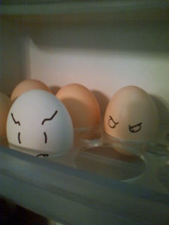 火曜日は、某スーパーで9時から、卵98円の特売があるので、たいてい毎週行っています。9時から買い物すると、他のお店はまだ開店前だから、そのスーパーだけで買い物して、9時半にはに帰ってきてしまうので、その後のまるまる一日が、ものすごく有意義に使えます。で、今日も98円卵を買って帰宅。冷蔵庫の卵ポケットにしまおうとしたら、残っていた卵が、こんな状態にこんないたずらをするのは、そう、パパです思わず、「うわぁ」と大声をあげ、脱力しちゃって、冷蔵庫の扉開けたまま、座り込んでしまいました聞いたら、昨日の夜に1個、一昨日の夜に1個、落書きしたそうです。ここ3日間、夕飯はカレー続きで、卵ポケットを見もしなかったので、全っ然、気づきませんでしたalexに見せたら、「何やってんの、ママ」と冷たい反応。「パパがやったんだよ」と言ったら、大きなため息をついていました