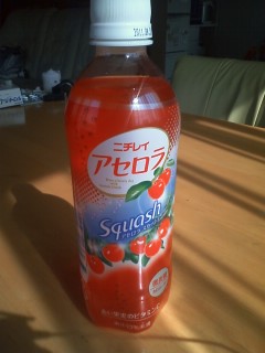 いきなり、悲しいこと考えちゃって、大泣きしてみたり、かと思えば、非現実の世界にどっぷり浸っちゃって、ひとりニヤニヤしてみたり。この感情の浮き沈みの落差に、自分が一番驚いています。これ、地震の影響とかじゃなくて、更年期の始まりなのかもしれないですねー。両方の相乗効果なのかもしれないですけど。今日の楽しい感情の最高潮は、買い物に行ったスーパーで。3/15にニチレイさんから新発売されていた「アセロラスカッシュ」です炭酸飲料大好きな私、普段アセロラドリンクとかはあまり飲まないんですが、これには、思わず飛びついちゃいました。パッケージの赤の鮮やかさ、元気が出そうなビタミンCに、相当惹かれたのかもしれません甘さと酸味の、絶妙なハーモニーってやつですよ、これは。「アセロラ体操」のCMを思い出しつつ飲むと、なんだか元気になれます