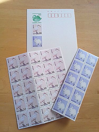 6月。とうとう値上げです。はがき。この一ヶ月ぐらい、家にあるはがきを使ってしまおう、と、手当たり次第、懸賞に応募してきたのだけれど、わかってはいたけど、使いきれず。50円はがきが55枚、往復はがきが2枚。今日からは、これに、10円切手(トキ)と2円切手(もふもふうさぎ)を貼らないといけないのね…。12円切手(かぶとむし)も、過去には発売されていたらしいけど、今は売ってないので。52円のはがきは、さらにたくさん残っているのだけれど、まずは、50円はがきから、使わねば。50円はがきを引っ張り出してる最中に、発見。郵便番号枠5ケタの封筒と、上から貼る7ケタのシール。7ケタになったのは、1998年。20年近く前!なんで、後生大事に取っておいたのか(笑)。