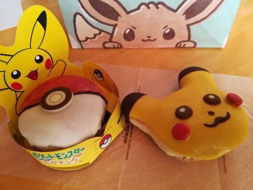 買い物に行ったショッピングモールにいたので、連れて帰ってきた。ネット上で、店舗によって出来が違う、と言われていたので、どんなもんかと思ったけど、ここの店舗、上手じゃない?ちゃんとピカチュウだよ。ちなみに、ピカチュウは息子が、私はモンスターボールを。息子は、ドーナツを裏返して、ピカチュウであることを伏せた上で、右耳から。途中、表にしたら、笑顔の口元だけ残っていて、一気に、罪悪感が押し寄せてきた様子(笑)。
