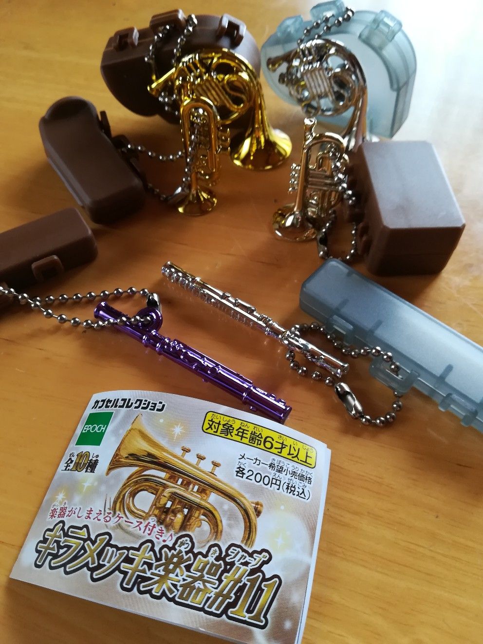 「キラメッキ楽器」このガチャだけは、見つけたら、何も考えずに、やる。カバンにつけるわけでもない、もう楽器吹いてないから、楽器ケースにつけても意味はないし、コレクションしてるわけでもない。ただ、条件反射的に。新シリーズが出た、と中・高の先輩のFBで知り、その翌日、いつもキラメッキ楽器を入れてくれているスーパーに行くも、見当たらず。今日行ったショッピングモールで、買い物を終えて、駐車場へ行く出口のすぐ手前のところで、発見。慌てて、トレーディングカード屋さんのところまで行って両替して、いざ。1,200円の散財。Flute2個にHorn2個、TrumpetとCornetが1個ずつ。高校3年間は、顧問の先生のご意向でCornetで過ごしていたので、Cornetが出た時は、お!と声をあげてしまった。(^^;)今回の#11シリーズには、Cornetだけじゃなく、BassClarinetもある。毎回、10種類のなかに、ひとつかふたつ、メジャーとはいえない楽器を混ぜてくるところが、マニアの心をくすぐる。だったら、いっそのこと、付属品も入れてしまえばいい。譜面台、ミュート、指揮棒、チューナー。でも、これらが出たら、確実に、楽器当てたくて、もう一度やるな。