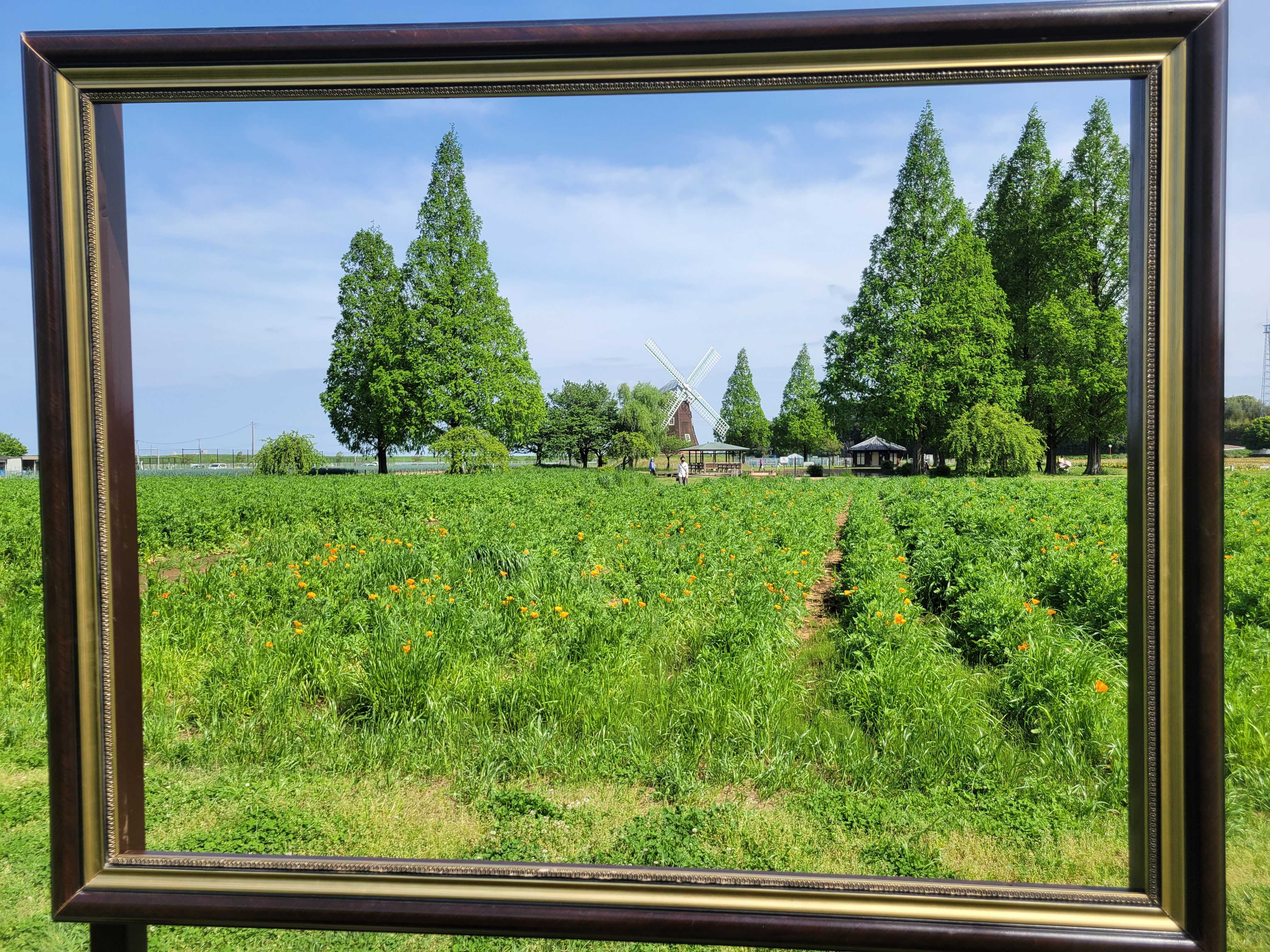 ウォーキングを始めたら、急に陽が射し始めた。でも、東からの風は結構強めに吹いていて、背中は陽の光で暑いのに、向かい風は冷たい、というギャップ。体の中はどんどん暑くなっていくのに、顔とか手とかの表面は冷たいまま。チューリップの終わったいつもの公園は、平日なこともあって、がらがら。休日には長い列ができる、花畑の中の、写真撮影用のどこでもドアや額縁も、今日は撮り放題。撮ったところで、まだ、ポピーはぽつぽつとしか咲いていないのだけれど。来週再来週ぐらいになれば、真っ赤なポピー畑の向こうに風車、という、素敵な写真が撮れるのでしょう。