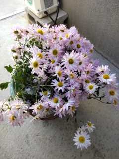 キレイなお花が供えてあったけど、庭から摘んでいった菊を入るだけ詰め込んで追加し…