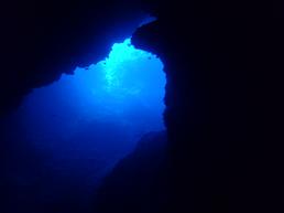沖縄本島の最北端『辺戸岬』ここに海の中からしか行けない、見れない鍾乳洞がある。海峡が良くないと行けない夏限定のダイビングポイント。遠いので、リクエストと行きたい人数が揃わないとなかなか行かないポイント。なので海は私達のみの貸切状態。ラッキー水深20mぐらいの所に穴が空いており、そこから奥に入って行く。ライトがないと真っ暗闇の中。しばらくすると、海水と淡水が混ざり合い、視界がもやもやし始める。濁っているわけではなく、水質の違う水が混在している水中で、その水質の違いから発生する水の層(ケモクライン)だから、前が少し見にくい。そんな中で古代人が火を焚いたススの痕が残ってる部分に出会う。黒い部分がススです。地殻変動で沈下した事がうかがえる。そんな状態を見ながらどんどん奥へ進んで行くにつれどんどん水温が低下してくる。どうやら淡水部分が濃くなっているようだ。 そして淡水に変わり、水上に顔を出すと大きな鍾乳洞のドームになっている。上記写真から判るように、水中と水上の鍾乳石の色が全く違う。 低い天井部分では、新たに鍾乳石が出来つつある。ドーム部分は隙間がある訳ではないのに酸素で満たされており、ちゃんと息ができる。息を吐くと、気温が低いからか白い息がライトで見える。他の人達は寒くて声が出なかったらしいのですが、自然の美しさと偉大さに魅了され、私の意識は鍾乳洞に向いており寒さも感じない程、圧倒されていました。機会があれば、ぜひ前もってリクエストして行ってみて下さい。(ダイバー限定ですが・・・)