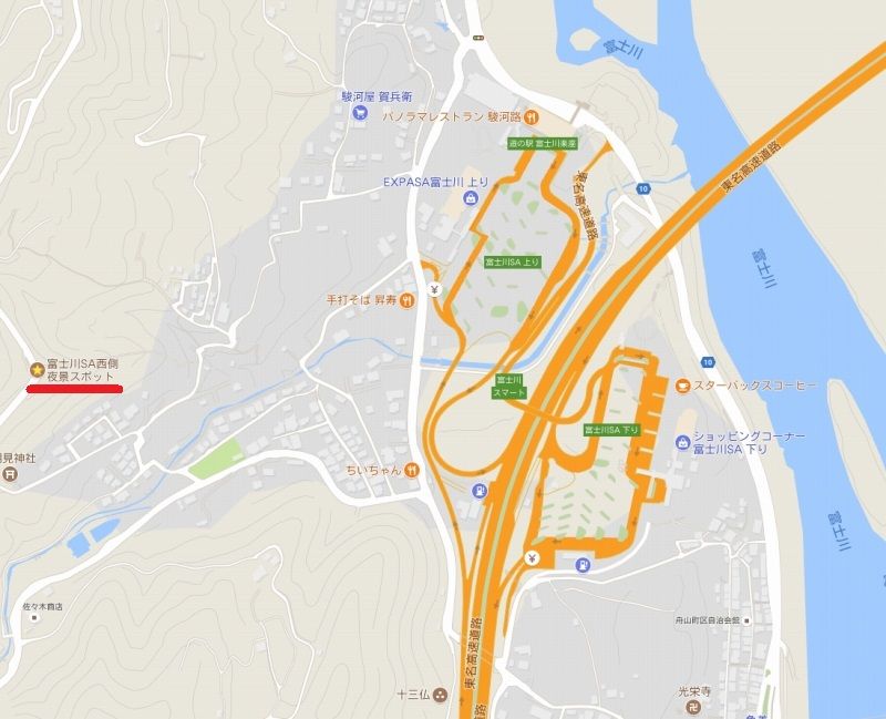 熱帯夜。あまりにも熱いので山の方に涼みに行こうと、Google map をみていて、「道の駅 富士川楽座」兼「EXPASA富士川」の近くに「富士川SA西側 夜景スポット」というのが観光名所として載っていたので行ってみました。 雨乞山の中腹で、車1台しか停めれません。 絶景~ SAがバッチリです。真ん中の灯りが眩しくって邪魔をするので隠してみました。 富士川と橋?高速道路?を車が通る様子がくっきり判ります。ちなみに、観覧車は「道の駅 富士川楽座」兼「EXPASA富士川」の一部で2017年2月23日(木)「富士山の日」にOPENし、シースルーゴンドラもあるようです。まだ乗ってないので、シースルーゴンドラ狙いで空いたら行ってみようと思ってます。現地は集合写真でも撮れるようにか2段になった台もあり、昼間は富士山と富士市内の景色を写真に撮れるのかもしれません。ちょっぴり夕涼み、良かったです。
