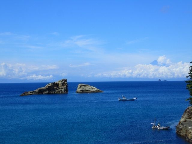 深く潜ったダイビングの後は高度の山越ができません。最短距離の真ん中ルートの天城越えはダメなので、ちょこちょこ寄り道しながら西側ルートを通って戻ります。雲見の牛着岩奥に雲に覆われた富士山が見えてます。 ここのところ、富士山の麓の富士市からも雲に覆われているので富士山登山の方はご来光を望むのは難しいでしょうね。下界は晴れてても、やはり梅雨が明けない事にはこんな感じなんでしょうね。寄り道1<松崎まちあるき>なまこ壁通りのある松崎町は歴史的建造物が沢山。薬学会の最高権威「近藤平三郎生家」 近藤平三郎氏はアルカロイドの研究に大きな足蹟を残した方。「時計塔」 時計塔は大正13年築→昭和13年水害により水没→昭和62年新設。統計等には「13」の文字が刻まれています。 日常にはない特別な時間が流れていることを表現されてます。 「明治商家 中瀬邸」 明治初期、呉服商を営んでいた依田家(主人は依田直吉)。ここで疑問。中瀬邸?依田邸?どっちが正しい?? で、聞いてみました。昔はこの周辺は海で「依田家」の周辺は瀬になっていたため、中瀬と呼ばれていました。このため「依田家」も屋号で「中瀬」と呼ばれていたことから、町が整備したときに「明治商家 中瀬邸」としたそうです。(by.松崎町観光協会)「時計塔と明治商家 中瀬邸」 他にも観光名所に指定されていませんが、昔ながらの雰囲気のある建造物が沢山。 とてもいい町並みでした。寄り道2<恋人岬> といおんせん← | →けっこん恋人岬 恋人岬の店長はネコ店長「らぶにゃん」です。 建物の入口前で恋人達を見守っている??恋人のモニュメント右奥に富士山が見えるはずなのですが、あいにく雲に隠れて見えません。 「金の鐘」 「愛の鐘」 それぞれ2人で3回鳴らすと恋が叶うと云い伝えられています。 老夫婦や既に結婚されているカップルは鳴らされてませんでしたが、なぜか家族連れは鳴らしています。記念ですからね~。 「銀の鐘」はグアムと姉妹岬協定が成立し、グアムに設置されています。愛の鐘からの眺望は絶景でした。 愛の鐘まではそこそこの道のりで、行きはよいよい、帰りは登り。汗だくです。 寄り道3<よしの滝>道路沿いに滝の看板があったので寄りました。看板から歩1分弱。 階段のようになっているのだが、自然の滝なのだろうか?それとも以前、温泉宿があってその庭園跡だろうか?(近くの看板から想像。)特に滝についての情報が何も設置されていないので、不明。ちょこちょこ寄り道とはいえ、堪能しました。